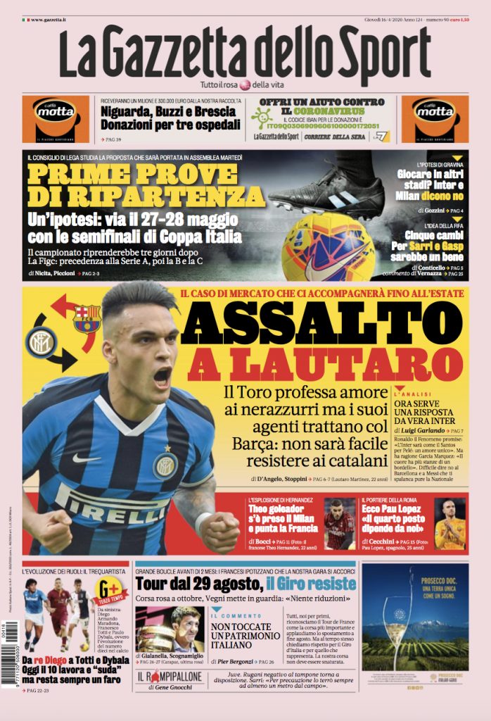 Le prime pagine dei quotidiani sportivi in edicola oggi, giovedƬ 16 aprile 2020.