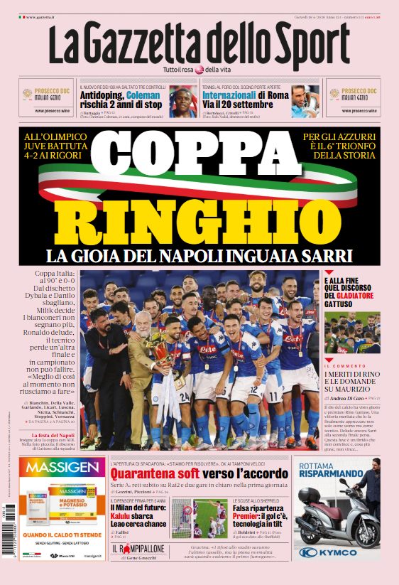 Le prime pagine dei quotidiani sportivi in edicola oggi, giovedƬ 18 giugno 2020.