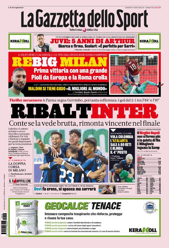 Le prime pagine dei quotidiani sportivi in edicola oggi lunedƬ 29 giugno 2020.