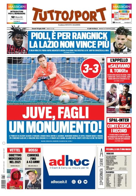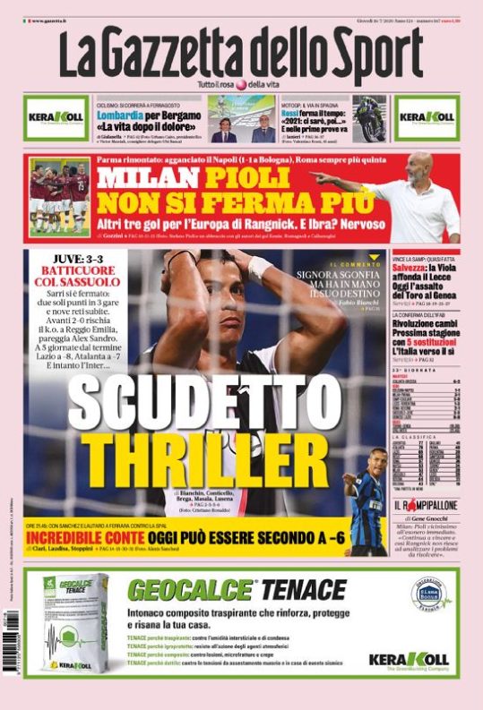 Le prime pagine dei quotidiani sportivi in edicola oggi, giovedì 16 luglio 2020.