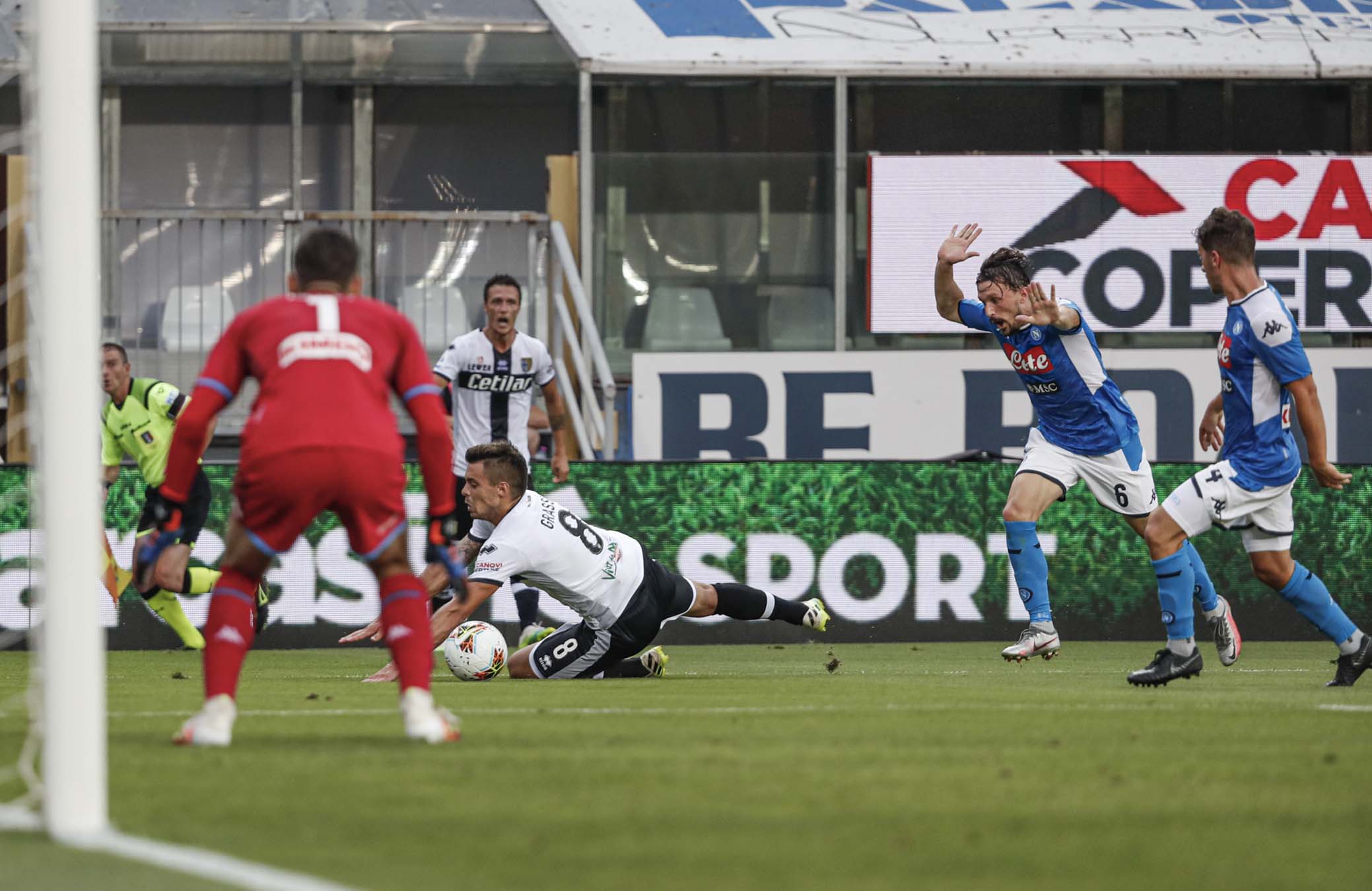 PARMA - ITALY, 22-07-20 - FOTO DI CASTALDI / SILPRESS, STADIO ENIO TARDINI - PARMA VS NAPOLI, NELLA FOTO: RIGORE LORENZO INSIGNE (NAPOLI) LUIGI SEPE (PARMA)