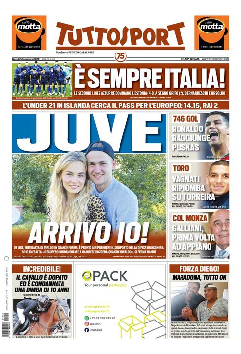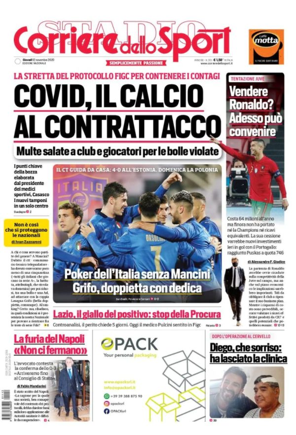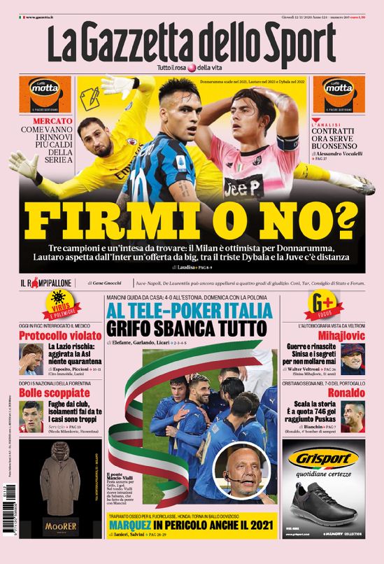 Le prime pagine dei quotidiani sportivi in edicola oggi, giovedì 12 novembre 2020.