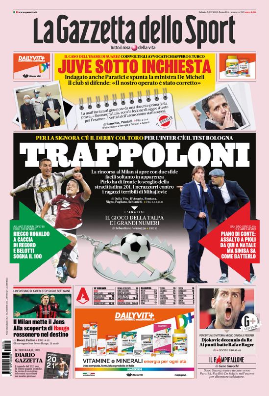 Le prime pagine dei quotidiani sportivi in edicola oggi, sabato 5 dicembre 2020.