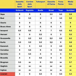 Sono pagelle che sanno di mediocrità quelle apparse oggi sui siti e sui quotidiani al seguito del Parma. In generale l’unica media voto davvero grave è quella di Yann Karamoh (4.8), per il resto sono tutti voti tra il sei e l’insufficienza scarsa, a sottolineare come il Parma visto ieri contro il Benevento sia andato a regimi di minimo sindacale. Gli unici voti che spiccano sono quello di Simone Iacoponi (media 6.5 per lui) e Matteo Scozzarella (6.2 nonostante un 5 dato dalla Gazzetta dello Sport che ci lascia qualche dubbio).
