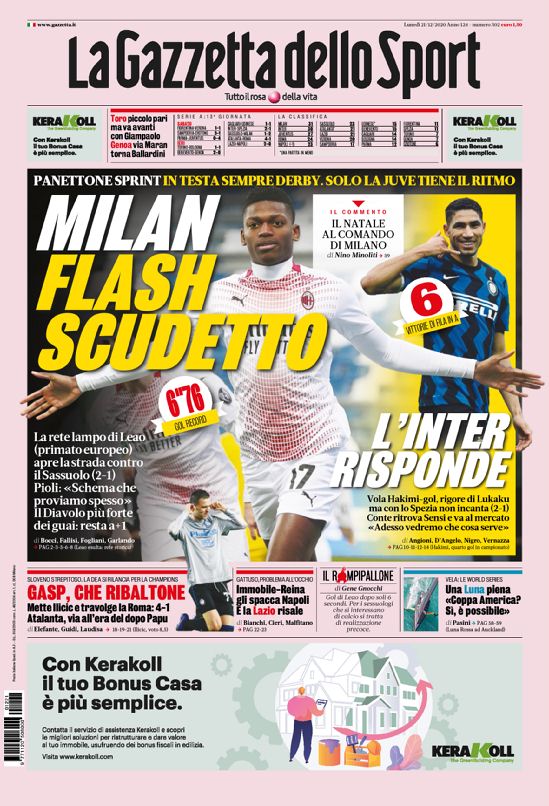 Le prima pagine di quotidiani sportivi in edicola oggi, lunedƬ 21 dicembre 2020.