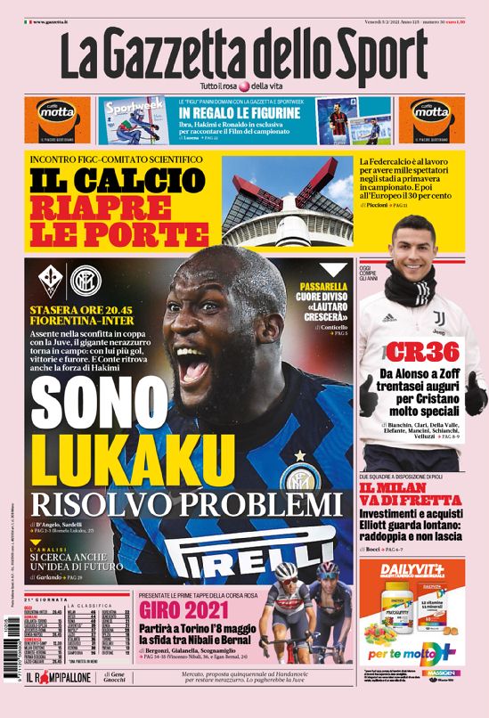 Le prime pagine dei quotidiani sportivi in edicola oggi, venerdƬ 5 febbraio 2021.