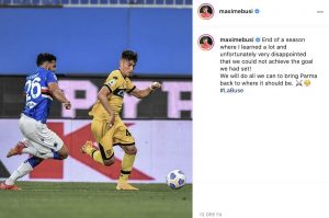 C’è poca voglia di parlare in casa Parma al termine di una stagione semplicemente disastrosa chiusa addirittura all’ultimo posto con l’onta, nelle ultime giornate, perfino del sorpasso da parte del Crotone. A questo punto non si può fare altro che guardare avanti e pensare al futuro sperando che sia roseo. Ne è convinto Maxime Busi che si è espresso attraverso il suo profilo Instagram ufficiale: “È stata una stagione in cui ho imparato molto che purtroppo si è conclusa senza essere riusciti a conquistare l’obiettivo che ci siamo prefissati. Faremo tutto il possibile per riportare il Parma dove merita di stare“.
