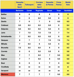 La bella prova offerta dal Parma, ieri sera, contro il Pordenone, si riflette nei voti riservati ai giocatori gialloblù dalla stampa nazionale e locale. Fatta eccezione per Correia, per tutti arriva almeno la sufficienza con la coppia Juric–Vazquez che si divide il primo gradino del podio dei migliori con una media di 7.4. Voti alti anche per i due subentrati Man e Inglese, a testimonianza della profondità della rosa a disposizione di Maresca.