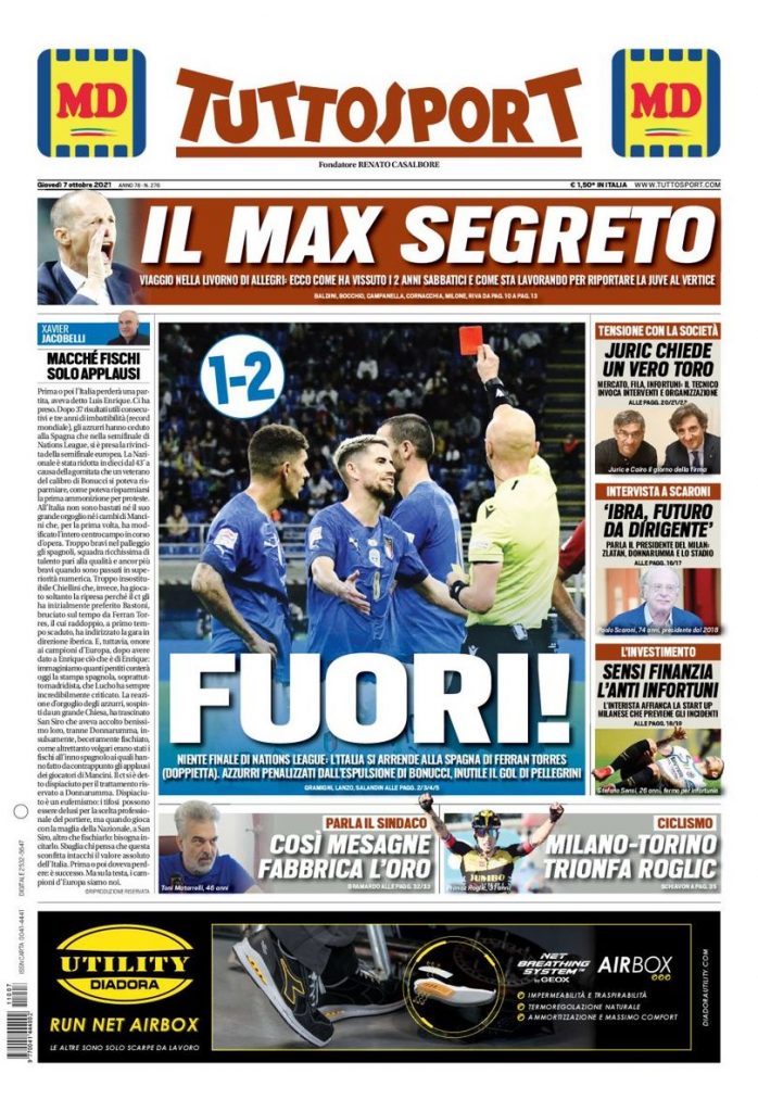 Le prime pagine dei quotidiani sportivi in edicola oggi, giovedì 7 ottobre 2021.