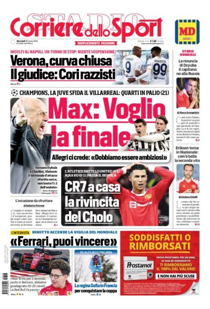 Queste le prime pagine dei principali quotidiani sportivi in edicola oggi