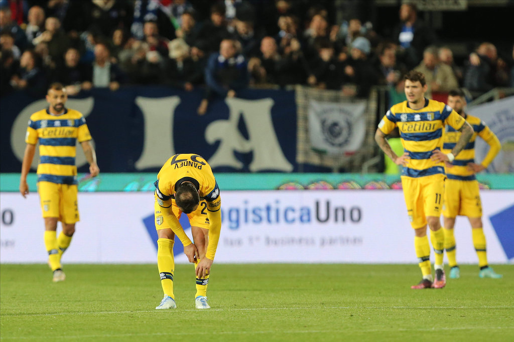 Players of PARMA CALCIO react during the Serie B match between Brescia Calcio and Parma Calcio at Stadio Mario Rigamonti on April 11, 2022 in Brescia, Italy.