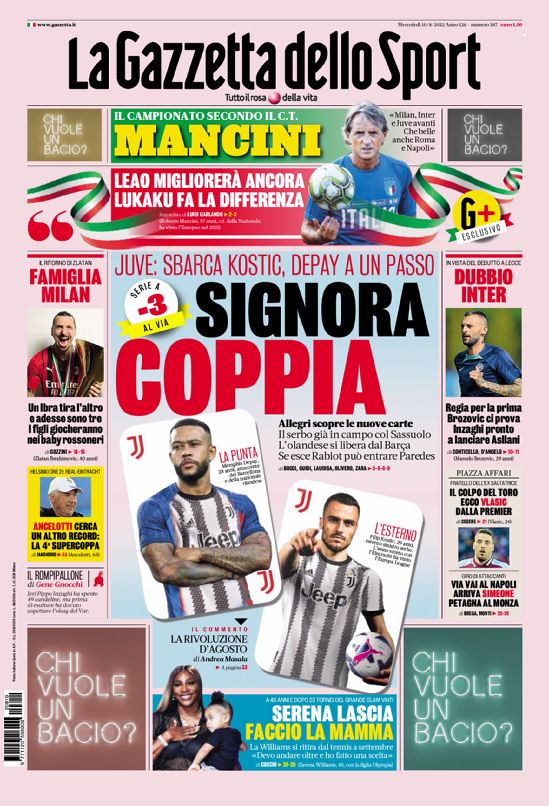 Le prime pagine dei quotidiani sportivi in edicola oggi, 10 agosto 2022.