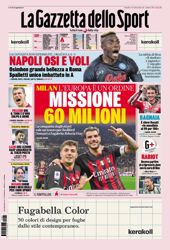 Le prime pagine dei quotidiani sportivi in edicola oggi, lunedƬ 24 ottobre 2022.