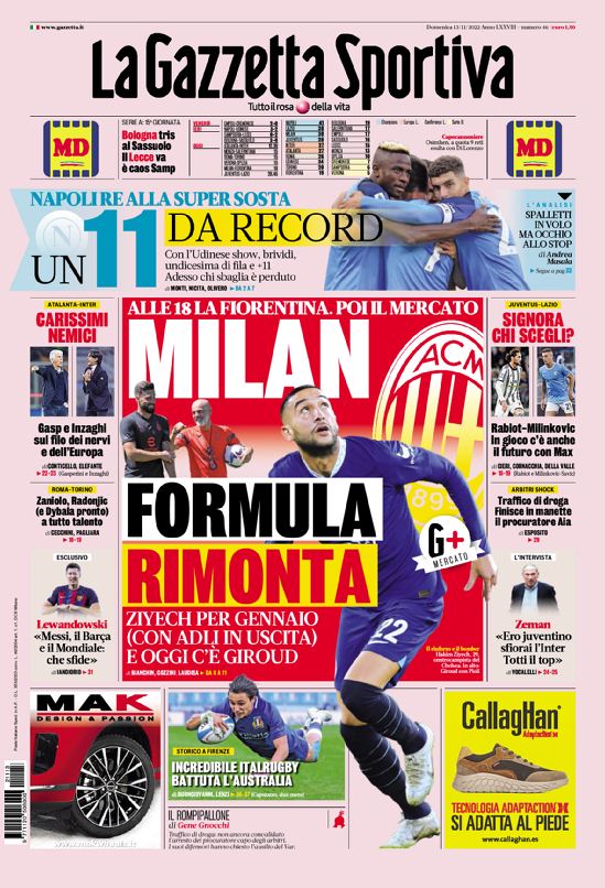 Le prime pagine dei quotidiani sportivi in edicola oggi, domenica 13 novembre 2022.