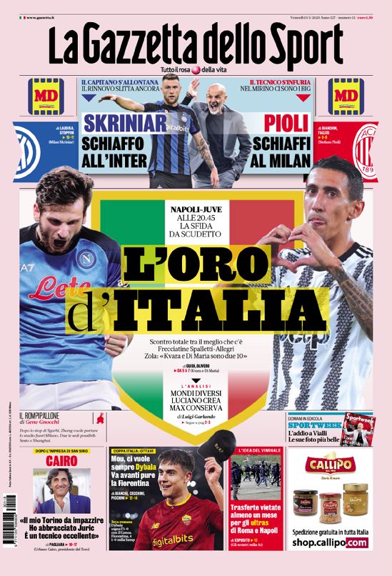 Le prime pagine dei quotidiani sportivi in edicola oggi, venerdƬ 13 gennaio 2023.