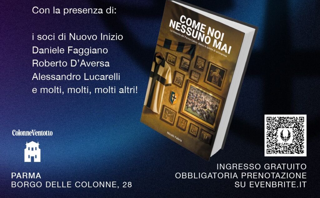 Si terrà questa sera, alle ore 21:00, la presentazione del libro “Come noi nessuno mai” di Gabriele Fabris che racconta la cavalcata del Parma dopo il fallimento, dalla ripartenza in Serie D fino al raggiungimento della Serie A con tre promozioni consecutive. Saranno presenti diversi protagonisti della storica impresa, dai “Sette soci” che hanno risollevato la squadra, passando per D’Aversa e diversi calciatori protagonisti in campo del percorso che ha portato il club crociato a tornare nella massima serie italiana. Una bella occasione per rivivere i momenti che hanno segnato la storia recente del Parma.